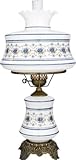 Abigail Adams with Antique Brass Finish: Quoizel got its start in 1930 by creating these hurricane style lamps. Today, Quoizel still makes this timeless design. This piece features a blown glass shade, as well as a lighted base. The white glass is embellished with a soft blue floral pattern, and the intricate metal base is finished in an antique brass patina. This is an heirloom piece to be passed down for generations.
