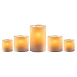 Light up your space with this LED candle set. Place them anywhere and start up the low glow of a life-like candle with the push of a button. Unscented. Requires 3 "AAA" batteries for each candle (not included). ||Number of Pieces: 5 ||Scent: Unscented ||Material: Plastic ||Battery: required, not included: 4 AAA ||Imported